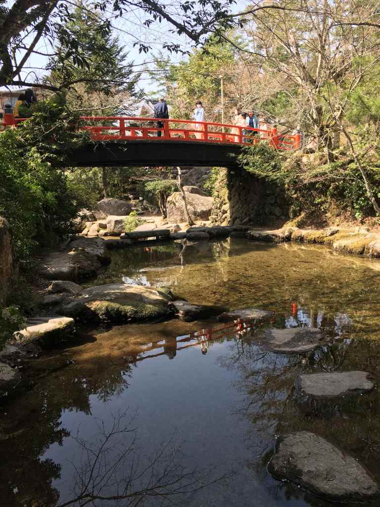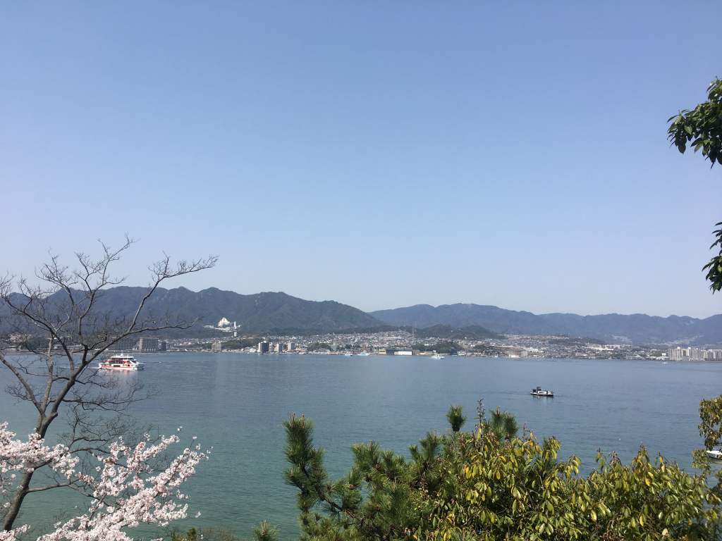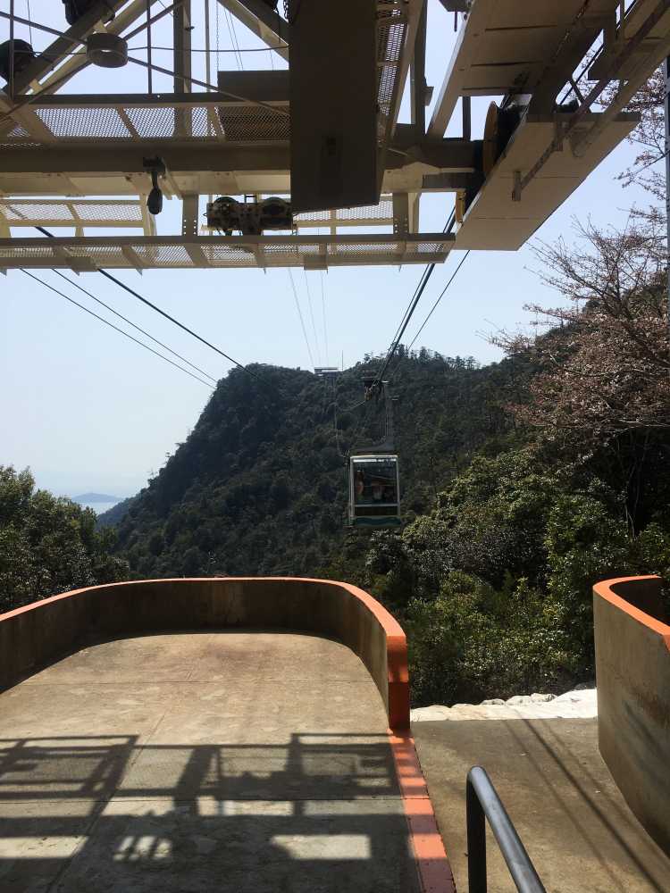 It’s a steep walk and the humid air soon leaves us breathless. We check our map once again and realize that we can take a cable car to the top of one of the island’s mountains. A short walk later, we arrive at the ticket office. We join the long line of people and queue for about 30 minutes. Then, we can finally take the scariest cable car ride of my life – and being Swiss I have experienced many of those. The rope swings up and down and I wouldn’t be surprised if one of the passengers got motion-sick. Nevertheless, we make it to the other side of the steep gorge and are rewarded with an amazing view over Hiroshima Bay. It’s easy to understand why this ranks among the three most beautiful landscapes of Japan.