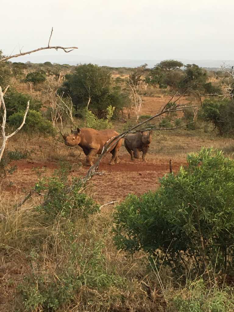Later that night we enjoy an incredible barbeque in the middle of the bush, with the rangers watching out for rhinos. On the following day, the groom and his friends sleep in, while the other girls and I opt for a sunrise game drive. The cold winter air helps to wake everyone up and we ask the ranger to take us to the area where the other group spotted rhinos the day before. He is happy about our interest in his favourite animal and tells the driver to head south. A 30-minute drive later we arrive, just in time to see two white rhinos walking up to a waterhole. The ranger tells us that we can go for a short walk while he sets up coffee and breakfast tea. With the rhinos close by, knowing how fast they can run, we do jump out of the Jeep but don’t walk too far away. I hold onto my warm mug of tea and watch the animals around the waterhole drink and the birds chatter. And again, I am perfectly happy and grateful for this incredible experience.