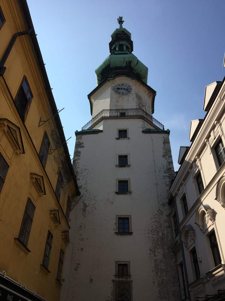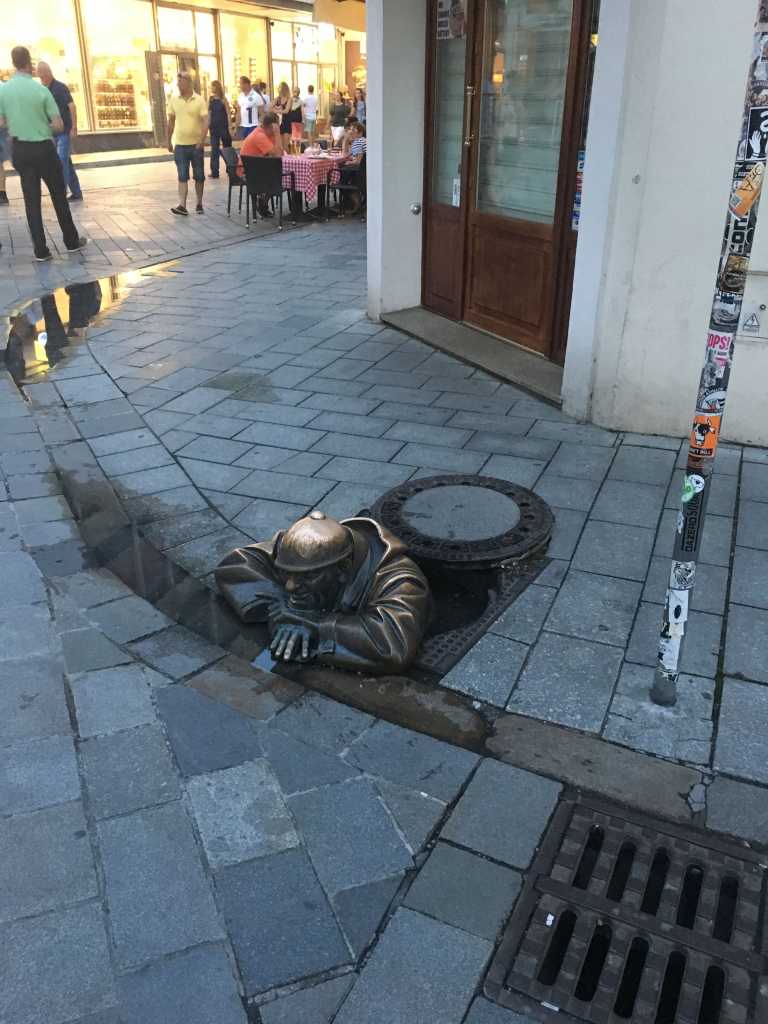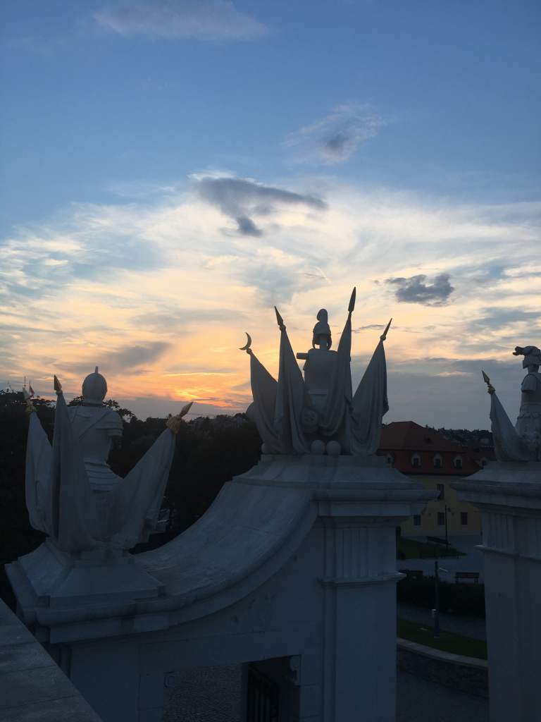 On our second full day in the historic town we go full tourist mode. After another delicious brunch, we visit the famous town hall with a high tower with a magnificent view on the Old Town and the castle. Next on the list are all of the numerous statues we’ve been seeing on our previous strolls. We make it our mission to copy all of them as closely as possible – and dare I say, we do a pretty good job! In the afternoon we do some shopping and then go for a short nap. Freshly energized, we climb up to the castle for sunset. We walk through the garden and then find a spot on the fortification wall to drink our beer and enjoy the gorgeous view. Later we head back down to town and go for dinner at a traditional Slovak restaurant/brewery in a pretty courtyard.