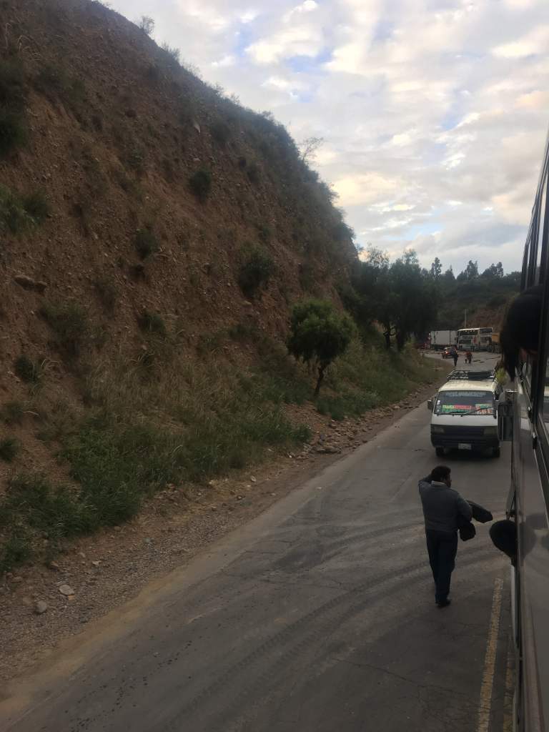 About 30 km before arriving at our destination the bus suddenly stops. Nobody seems to be suprised by that and I only quickly look out the window to see a long line of vehicles in front of us. After 15 minutes of not moving, the bus driver decides to take over the standing cars, even though he can’t see what awaits us behind the next corner. We drive past other waiting cars for about 5 kms on the oncoming lane until we can’t go any further there either. The two lane street is now completely blocked with vehicles trying to get to Cochabamba.