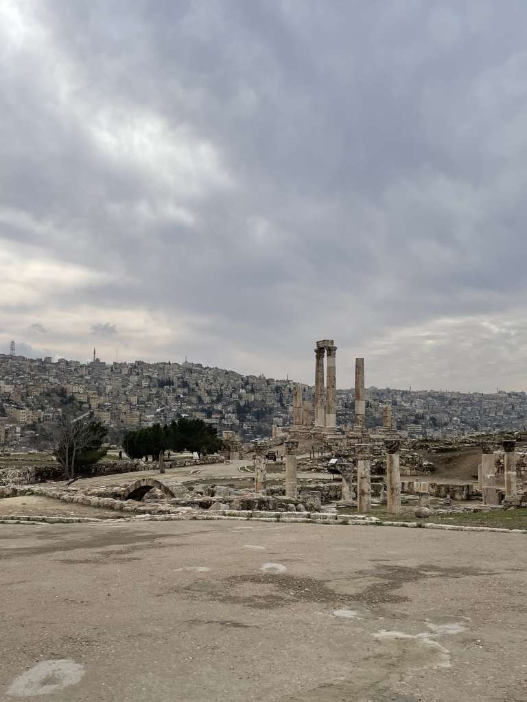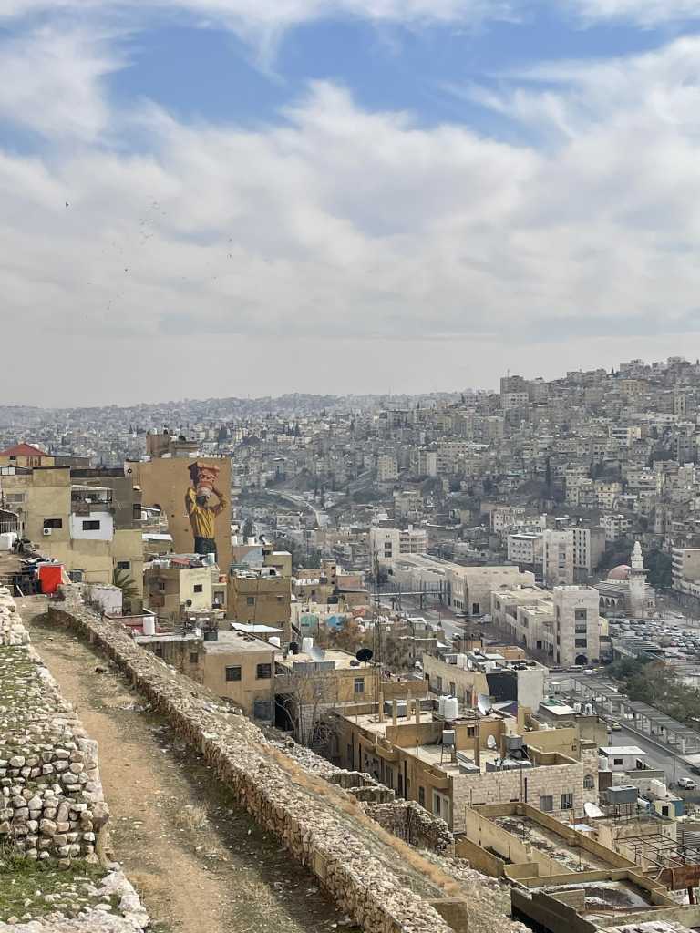 And now the walk begins. The city of Amman spreads out over 19 hills, so no matter your destination, you will find yourself covering a lot of altitudes. Today, I am first heading up the hill behind the hostel to visit the archaeological site of the ancient Citadel. The exposed location offers 360° views of the surrounding city centre and several landmarks. Don’t miss the giant Jordanian flag to the East, the Roman Theater to the South and on its left the mega-mural called “The Column”. It shows a Jordanian man carrying a piece of a column from Petra on his head. After exploring the Citadell’s ruins for a bit, I head back down the hill towards the Roman theatre.