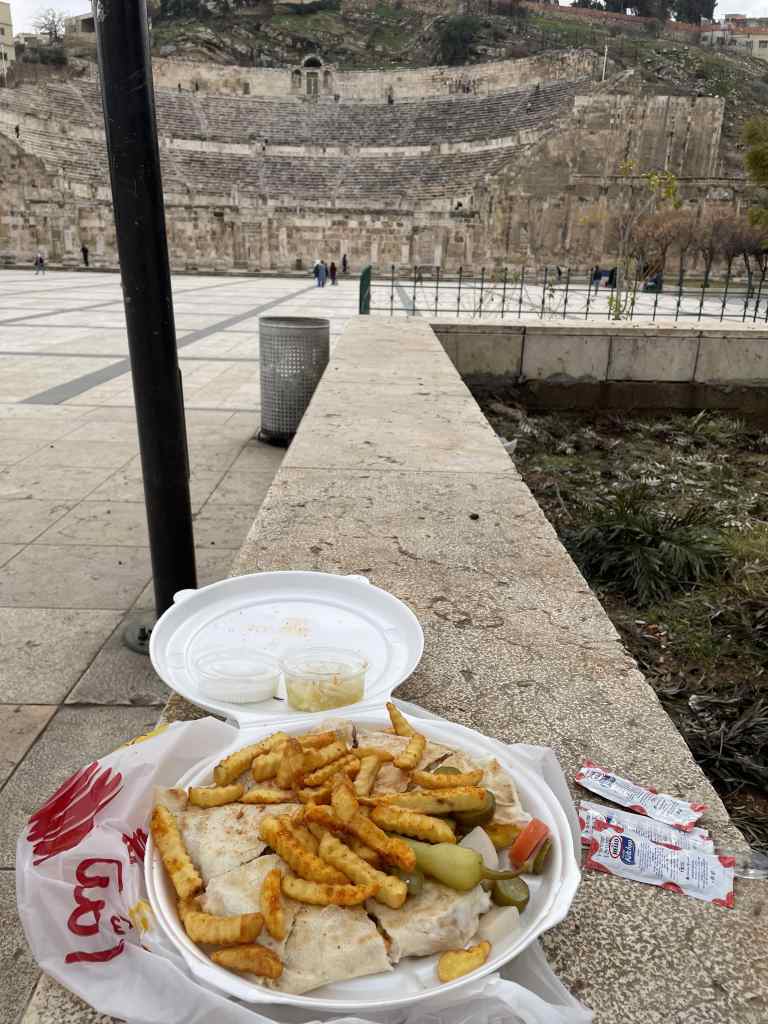 The owner is an old Palestinian man who happens to speak some German as he was living in Cologne for a few years. He says he eventually returned to the Middle East because he missed his family and the lively streets. He dreams of being laid to rest in his birthplace of Jaffa but knows that he will likely never set foot there again. Moved by this encounter, I take my (giant) Shawarma to the square in front of the Amphitheater across the street and sit down on one of the low walls for my meal.I watch the kids play, tourists take their souvenir pictures and groups of teenage girls snickering.