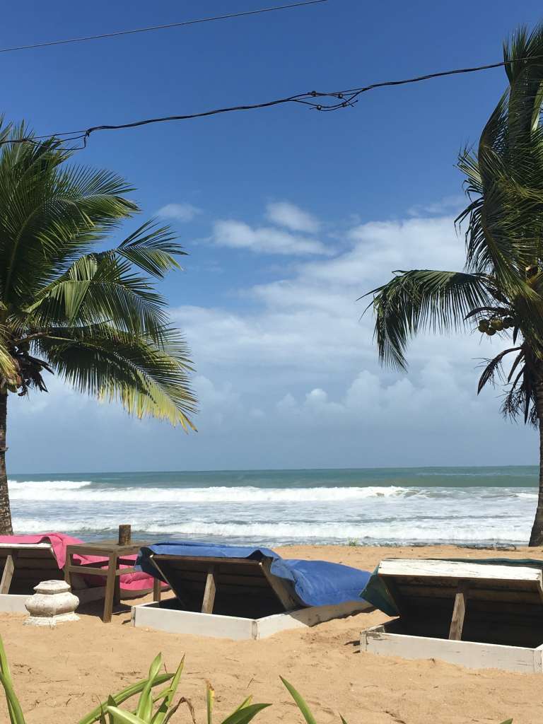 We return to the waterfront street and this time turn left. The terrain is pleasantly flat and we make good progress. Until we reach the end of the asphalt street and enter a sandy patch, which turns into a full-on beach soon after. Fortunately, there is now a breeze from the sea and it’s not long before we reach the Paunch Beach Club. We decide to take a break here. We park our bikes, grab 3 sun beds and dive into the refreshing waves of the Caribbean Sea. Once we’re dried off, we get some smoothies and delicious pizza before a quick nap in the sun. And then it’s already time to make our way back to town to return the bikes. Now that we know the way, this was supposed to be an easy ride. However, suddenly, Dario’s bike’s chain strikes. After fixing it for the third time, it doesn’t move at all, and he resorts to pushing the bike.