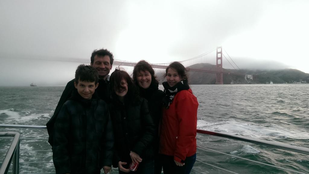 As per my Dad’s wish, we go on a Sunset Cruise with a Catamaran. It leaves from smelly Pier 38 and takes us north past Alcatraz Island before turning west. Now we’re headed straight towards where the famous Golden Gate Bridge is hiding behind a wall of mist. Then the clouds finally lift, and we catch a glimpse of the giant structure and a moment later sail underneath it. On the other side we turn and return to the city, now watching the skyline with the lights slowly coming on. Despite the weather, all of us agree that this is already a highlight of our trip.