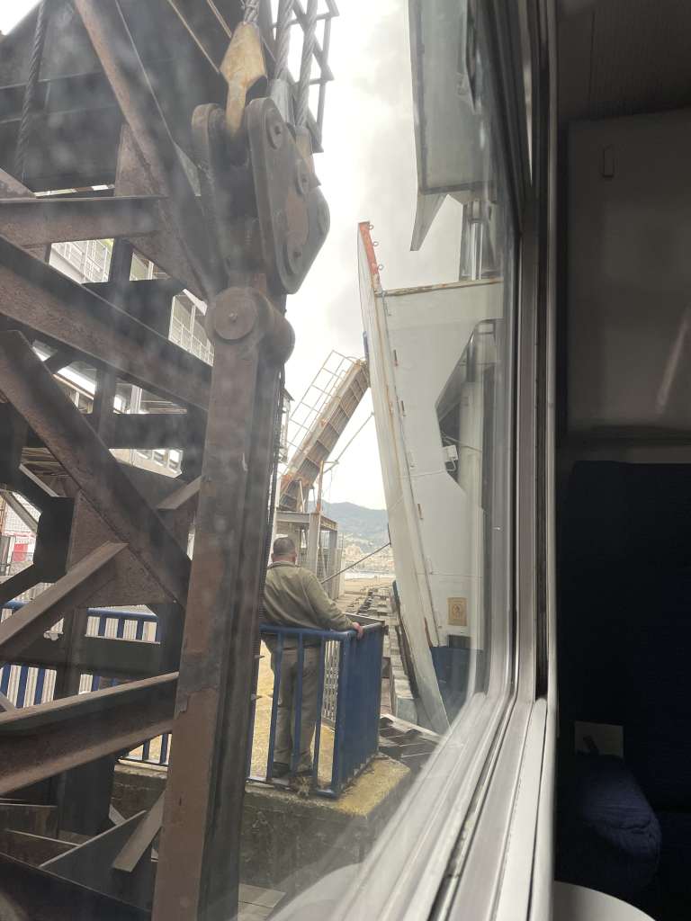 I get even more anxious when people start to get off the train, but am somewhat relaxed when I recognize the conductor smoking on the platform. And then the Spanish couple a few rows down gets back onto the train. They are facetiming with someone and very loudly ask the other person to „Guess where we are!“. Of course the lady on the other end has no clue, and so they excitedly explain. „We’re in a train that’s going to be boarding a ferry to cross the ocean!“ I am as surprised as the lady they’re talking to on the phone and, not for the first time in my life, glad that I speak Spanish.