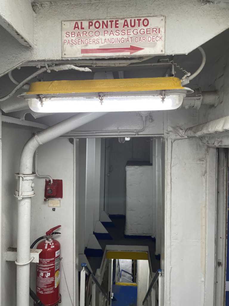 I don’t listen to the rest of their conversation, but am thinking about HOW they will be transferring the full lengths train on a boat. It might be a large ferry, but surely it can’t be THAT large. Moments later the train slowly rolls backwards, stops again, and then switching rails rolls forward again. We go around a curve and suddenly there is a gaping hole in front of us. It’s the lower deck of a boat. We roll past men in yellow security vests and come to a halt once we’re inside the ferry. Then the power is cut, the lights turn off, and all of us sit in the dark in complete silence.