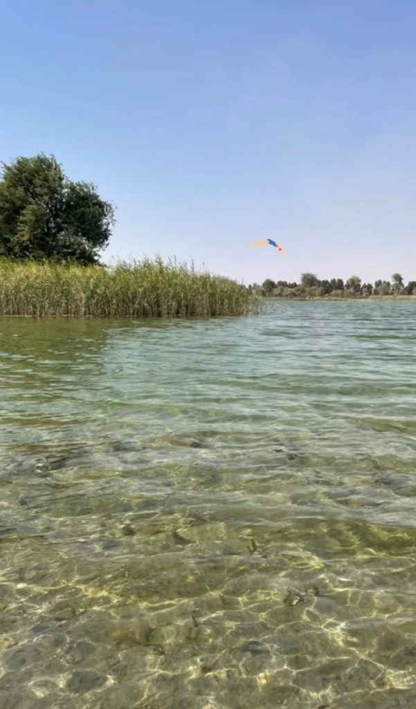 Our first stop is at a small lake marked as „Heart Lake“. Of course, all of these lakes in the middle of the desert are man-made and the Emirati architects are known for their extravagant designs. So it doesn’t surprise us that they built a heart-shaped lake. But the thing is, you can only see the lake‘s shape from the air with a drone (or if you‘re really tall) because it‘s surrounded by lush bushes.