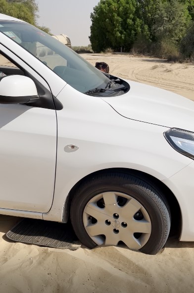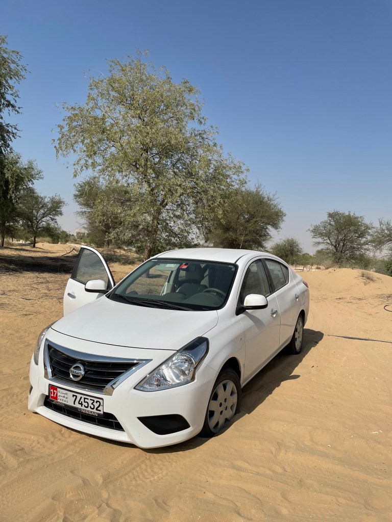 In a helpless effort of trying to get us moving, my roommate pushes the accelerator. But we don‘t move an inch. Pragmatically, the three of us step out of the car to assess the situation. All four wheels are sunken into the golden sand. The rear ones are about 2 meters from the more compact base of the dune, which encourages our immediate thought of trying to push the car backwards. My roomie gets back into the driver’s seat and starts the car in reverse.