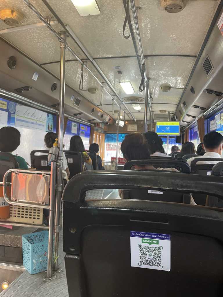 Navigating Bangkok by bus is quite easy. The schedules on Google Maps are quite accurate, and the bus stops with the blue signposts cannot be missed. There are almost always a number of locals waiting there too, and if they speak English they will be happy to help you out. Drivers will only stop when flagged down or if someone is getting off. The fee of 8B (no AC) or 13B (with AC) is collected by the conductor on the bus. To stop, simply press one of the red buttons.