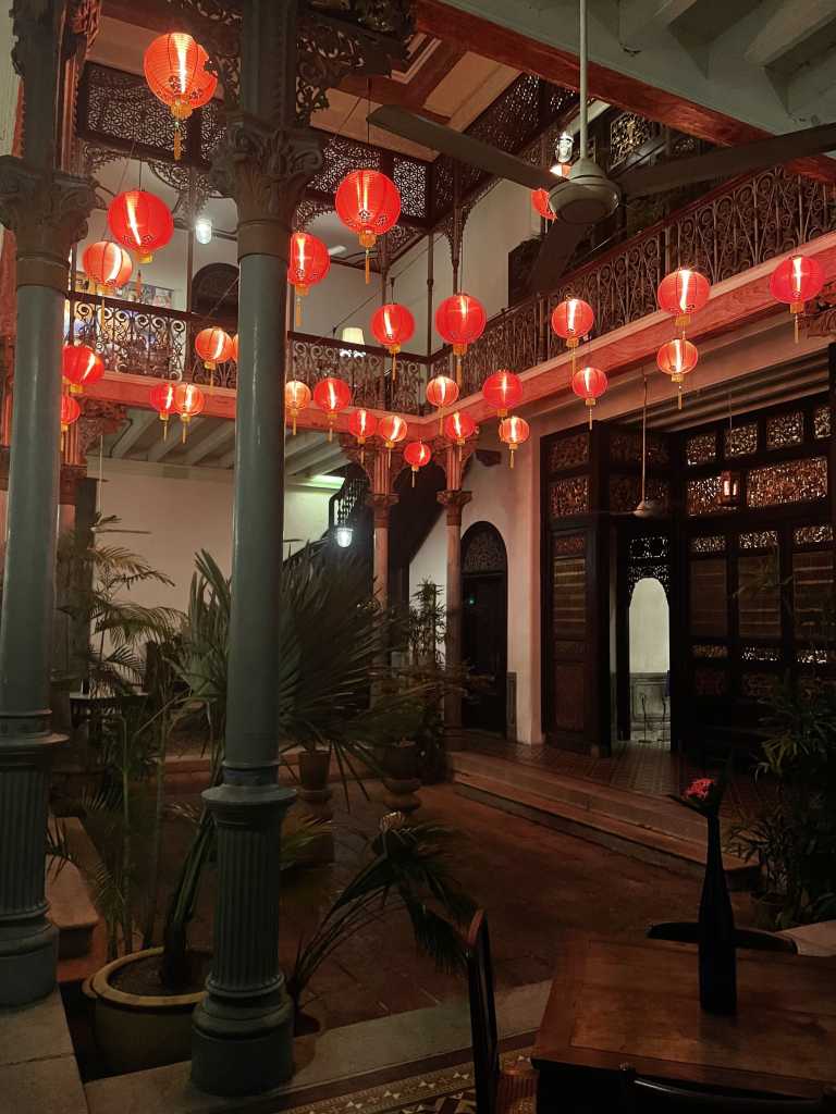 While I dig into my dinner, I see the dark rain clouds slowly approaching from the mainland, bringing with them a beautiful rainbow. I quickly eat up and under the last rays of sunshine walk to the Blue Mansion. I learned that apart from the restaurant, they also have a bar. The grand 19th century building is just as stunning from inside as from outside. The upper floors are only accessible for hotel guests or if you go on the daily guided tour. So I have a look at the ground floor rooms before sitting down for an Amaretto Sour. Just as I begin the short walk back to my hostel, the clouds break, and I am drenched in no time. But hey, this is what you get for travelling in South East Asia during the rainy season.