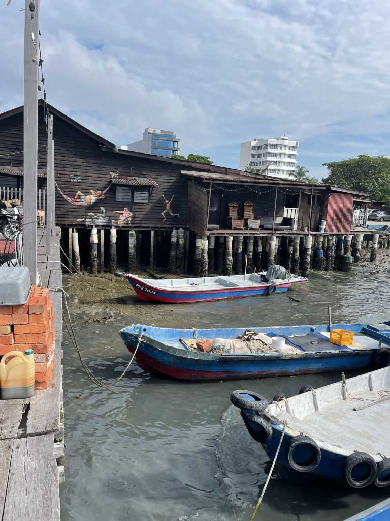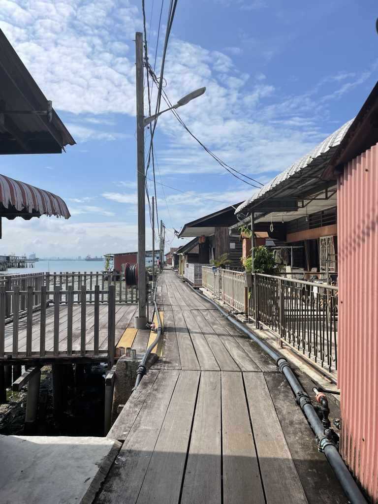 For my second and last day in George Town I have planned out a little more relaxed program. I start off the morning with a walk to the Clan Jetties of Penang. On the way I stop to look at various murals and wire street art. My favourites are the art pieces which combine a painting with everyday objects or the building’s façade to tell a story. I slowly progress to the eastern end of Pulau Penang and reach the pictures Chew Jetty. Like all the other 7 jetties on Penang, this stilt house village with a pier at its end, has been built by Chinese immigrants in the 19th century. I walk down the raised wooden walkway and here and there peek into the small houses on either side.