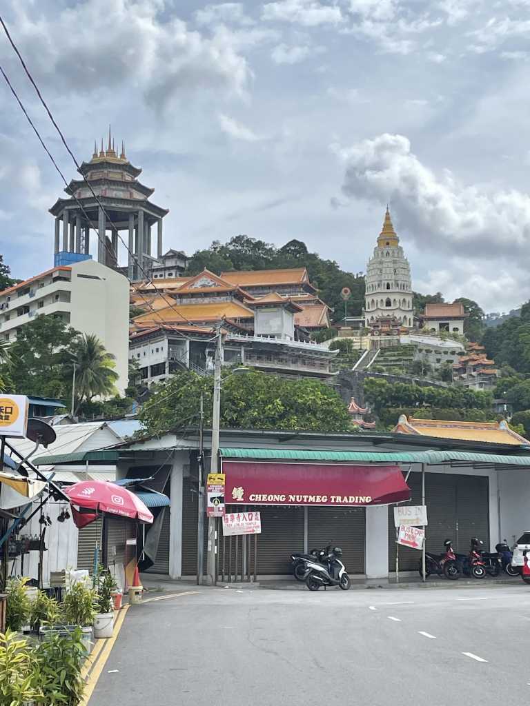 Its impressive Pagoda and the Kuan Yin statue can be seen from far away. I pass the turtle pond and arrive at what looks like the entrance to a car park. With the ongoing construction work, this second impression of the temple is a little bit of a letdown. However, I do not let that stop me and ask my way through to the internal courtyard. I spend a good hour wandering around, admiring the mixed architectural style including Chinese and Thai details and the view of the city. Then, the dark rain clouds seem to race straight toward me. Though my ultimate goal of the day – sunset on Penang Hill – seems to be in danger, I make my way back down to the main road.