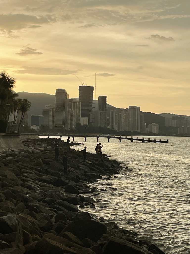 After this little break, I head back into the bustling streets of Chinatown. Last on my to-do list to be completed before my stay on the Perhentian Islands is a fresh haircut. My hair has got too long for the tropical climate, and so I spend a relaxing couple o hours at De Love Hair salon. Afterwards, I treat myself to the most delicious mousse au chocolate I have had in a while. Then I retreat to my hostel for a couple of hours before hitting the streets again in time for sunset. The girl I met the first night told me about a spot at the shorefront, where there are usually only some local fishermen and few tourists watching the sun go down. I get myself some Keema from a Pakistani street food place and then head to the stones at the water.