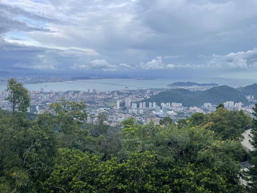 After 20 minutes, I finally reach the bottom station of the funicular station. I pay the 15 MR for my ticket up, still considering walking back down. With a good hour left until the sun was scheduled to set, I explore the hilltop and watch some monkeys play in the lush trees towering above George Town. I was sweating all day, walking through the sea-level streets. But now at 800 m.a.s.l. with the wind blowing, I actually wouldn’t mind wearing a jumper. Of course, I didn’t bring one and because of the still dark clouds still hovering to the west of the island, the sunset isn’t great either. So I decide to catch the funicular down after all and head back to the city centre.