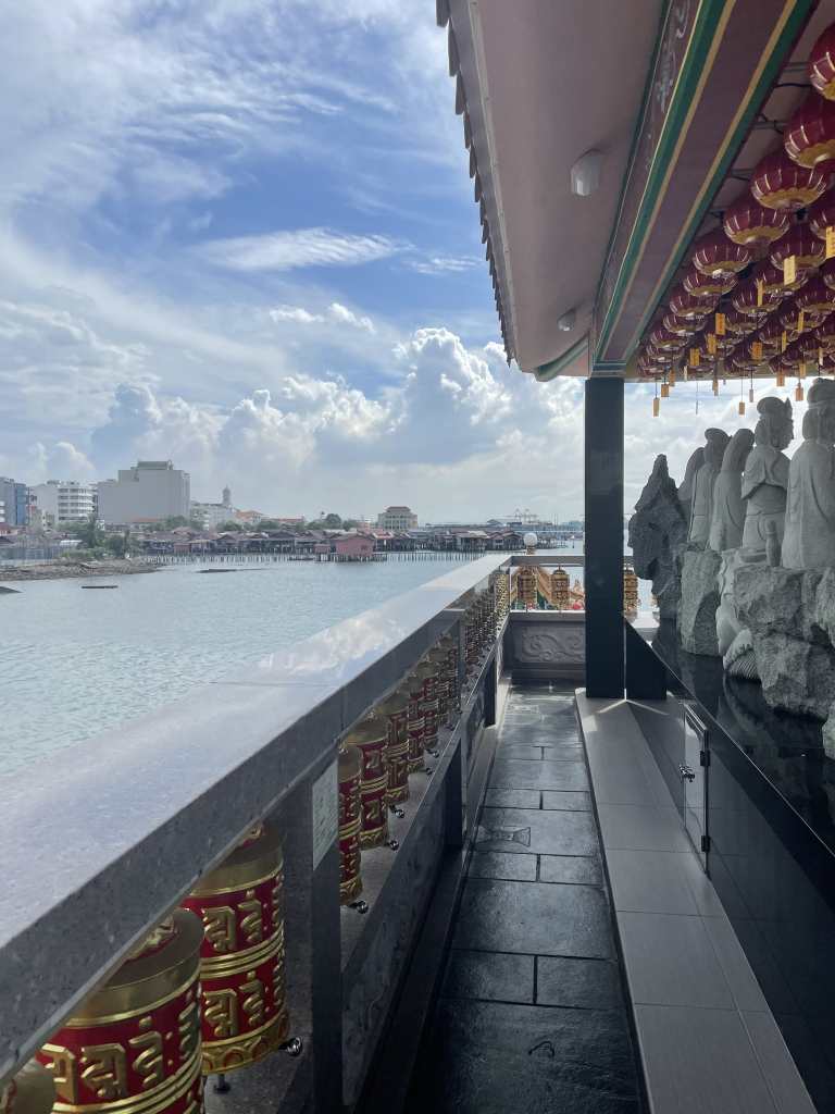 While a couple of them have been turned into souvenir shops or noodle restaurants, most are still used as family homes. At one corner, I hear 2 old ladies having a lively conversation in Chinese. They chatter and laugh, and I’d love to be able to understand what they’re saying. But I can’t make out a word, and so I continue my stroll towards Yeoh Jetty. The most southern of the bunch has caught my eye because it’s home to a quite big Buddhist temple right on the water. There is a pleasant breeze blowing at the water front and meditative music playing from loudspeakers in the back of the temple. I sit down at one of the tables on the edge and watch the wind play with the small Chinese lanterns strung up above the number of white Buddha statues.