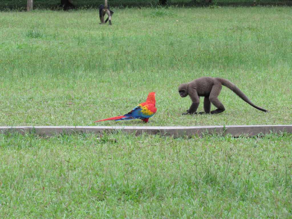 We get a first taste of the Amazonas wildlife: Davis shows us a giant centipede, birds and a snake. By now, we’re already up for a few hours and our tummies start to grumble. Fortunately, it’s lunchtime at the lodge, and we dig into the buffet with fried plantains, Amazon fish, a fruit plate and more. Knocked out by a full-on food coma, we have a little siesta in the hammocks on the stilt path to the jetty. It’s only Davis’ announcement that we’re going to see monkeys that finally gets us into the boat again in the afternoon. “Monkey Island” is a wildlife reserve dedicated to rescuing, rehabilitating and releasing monkeys and other sick or injured animals of the surrounding rainforest. There are small monkeys playing with Macaws (parrots) on the lawn, and we also spot some recovering sloths and toucans in their respective quarters. On the way back to the lodge, we enjoy the view of a beautiful sunset. But the day isn’t over yet!