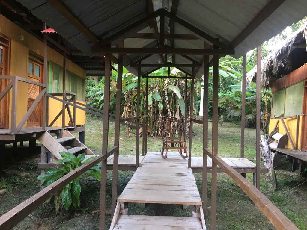 After another delicious meal (to the dislike of the other guests, we bunker the plate of fried plantains), it’s time for the night safari. Reassured by the fact that we didn’t see as many wild animals as we expected in the plain jungle, we cover ourselves in yet another layer of mosquito repellent and grab our torches. The clear night sky is full of twinkling stars. But as soon as we set foot into the lush jungle, the canopy of trees envelops us in darkness. While we mostly use our torches to see where we put our feet, Davis expertly points his torch up the trees and lianes. He introduces us to frogs, snakes and even a tarantula running about in the bushes. Though the walking itself isn’t very physically demanding, the complete darkness combined with the intense sounds of the jungle take their toll on us. And after an hour Melanie, Sarah and I are ready for a good night’s sleep.