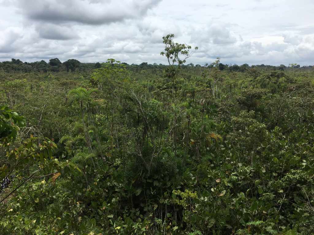 The next thing we know, the four of us board a small wooden rowing boat tied up at the swamp‘s edge. We‘re in the middle of the flooded area when Davis explains that there are alligators and anacondas silently swimming here right now. And 5 minutes later, he makes us step out of the boat, and into the same swamp to cover the last couple of meters to shore! Praying to the Pachamama that A: the anacondas & alligators are having lunch now somewhere else and B: Davis Machetes would protect us if they weren‘t, I step off the boat and in my rain boats quickly ran to the shore. I don‘t remember much of the following walk, except for Davis poking his Machete at a huge hole in the ground stating „hm, seems like the anaconda isn‘t home“. I‘m beyond relieved when we reach the goal of our little excursion: a 25-meter-high view tower. Though a lot of the surrounding trees still tower above us, we get a look at the impressive canopy of the rainforest. And a fresh mango, straight from the tree, as a snack.