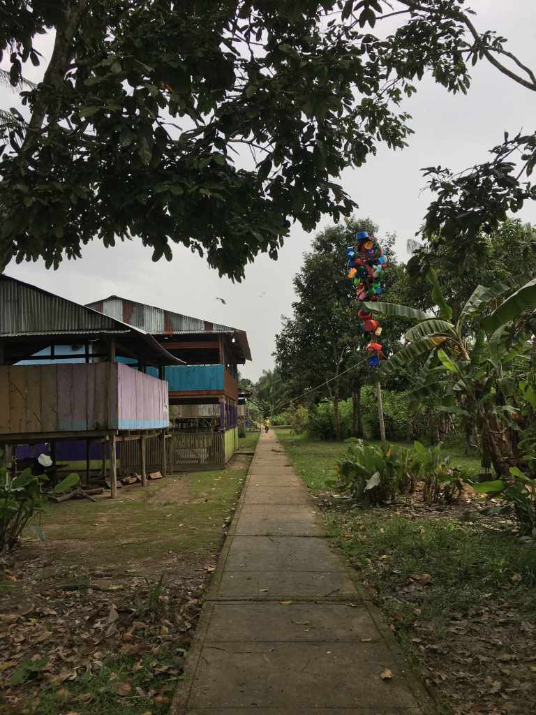 On the way back to the boat, we visit the community of Santa Maria de Fátima. It‘s a small village of stilt houses, located on the bank of the Amazonas. As it‘s carnival time in Perú, they have set up their traditional tree, decorated with plastic toys, on the „main square“. From somewhere in the distance, we hear the sound of drums and trumpets, but we cannot see a single soul (apart from some chickens and ducks picking under one of the houses). Once again crossing the plantation in the kayak, we make it back to our boat, where a delicious late lunch is waiting for us. It’s followed by a lazy afternoon in the hammocks before another gourmet dinner. We go to bed as the sun sets and for a while listen to the sounds of the jungle before drifting off to the land of dreams.