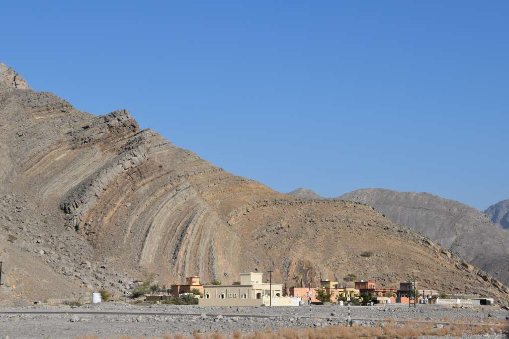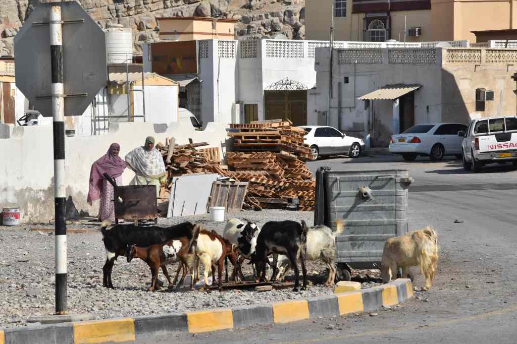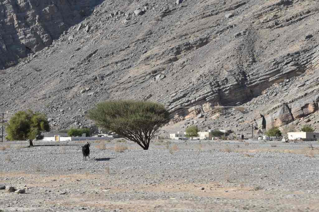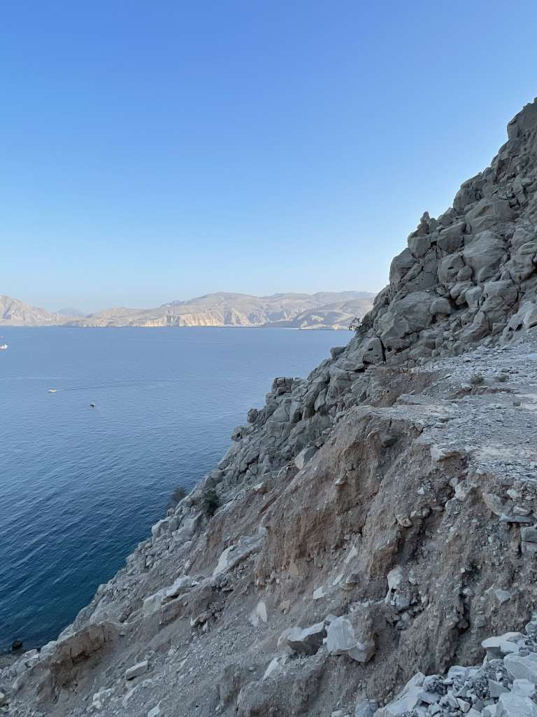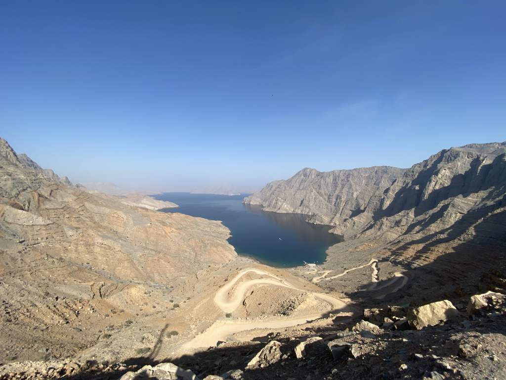 And the view only gets better. We‘re now overlooking the fjord we were boating on yesterday and the curvy road leading down to a very small port called Khor Najd. This HAS to be the birthplace of “one moment you’re on the road looking at the scenery, the next you’re in the scenery looking at the road”. We sit down next to the “I love Oman” sign and silently take in the serene scenery. After a while, Alina (goat fan #1) hears the bleating of a goat. Liana and I listen carefully, and then we hear it too. But none of us can actually see the wild animal. It’s only when I try to take a picture with Liana’s camera, and we zoom into the steep mountain’s north face, that we spot the lonely mountain goat on a small cliff. Wondering how she got there and what she was looking for on this rocky wall, we get back to marvelling at the deep blue water of the fjord.