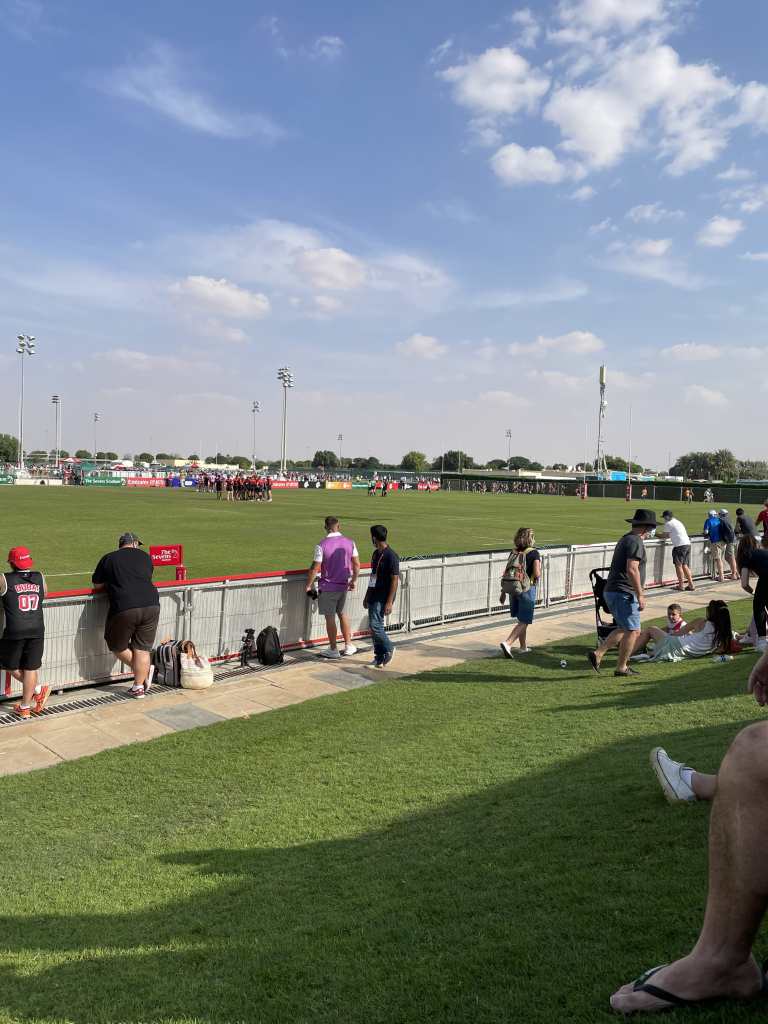 After almost driving around the whole site, we finally find the enormous parking area. There are no individual parking spots marked on the plain sand. However, most cars are parked in a somewhat orderly chequerboard manner. We lock the car and can only hope to find it again when we‘re heading back later because there is no way of pinpointing its location. The walk in the sun from our car to the entrance of the stadium takes us a good 10 minutes. On the way, we spot the UAE’s usual huge pickup trucks. The only thing missing is the big families who usually own these cars. Thinking that everyone is watching the games, we make it to the entrance, where we have to simply show the online ticket confirmation to the security guards. They don‘t ask us about covid vaccines like it‘s usually done. And it‘s here that we spot the first rugby fans.