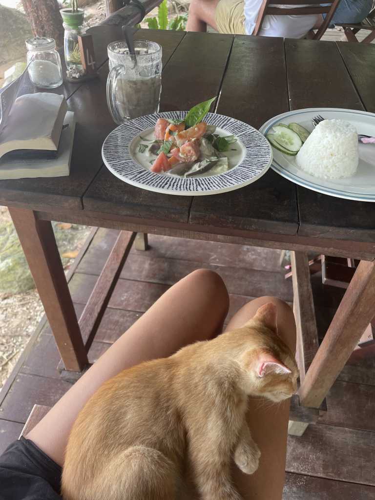 At around 11am, when all the guests have left, I head back to my room to change into my swimsuit. During the afternoon, I usually walk down the jungle path and explore the different beaches of Pulau Kecil (or Small Island). My favorite one to relax is Mira Beach (also known as Keranji Beach). It‘s only a 10 minutes walk away from Crocodile Rock Villas and with a couple of simple wooden huts set up right at the beach really feels like paradise. There is a small reef right at the beach where you can watch the colorful fish through the crystal clear water without even submerging your head into the ocean. And whenever I‘m hungry for Asian food, the bistro at the Keranji Resort is ready to serve delicious curries, fried rice, and banana pancakes. An added bonus is the friendly owner who‘s always down for a chat and the cute cats who sometimes have a nap in my lap during lunch and follow me home.
