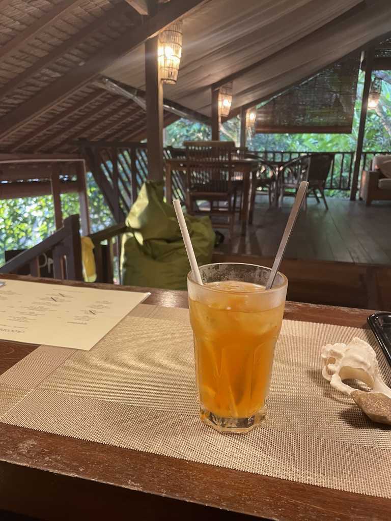 This first night, like most to come, I am lulled to sleep by the sounds of the jungle and the crashing waves. I do not wake up during the night‘s thunderstorm, and only notice the remains of the pre-monsoon rain when I leave my hut in the morning. After opening the terrace, I prepare the juice bar for the morning service and wait for the first guests to make their way to breakfast. Under the guidance of Atord I cut mangos, pineapples, watermelons, oranges, and ginger into the right size, so they can be processed into delicious juices. With a little help from a Nespresso machine(!) they make the best coffee on the island and the Malaysian tea straight from Cameron highlands doesn‘t disappoint either. Once the restaurant slows down, I eat my omelet with toast while watching the waves.