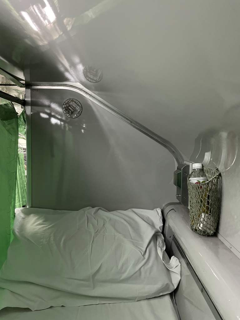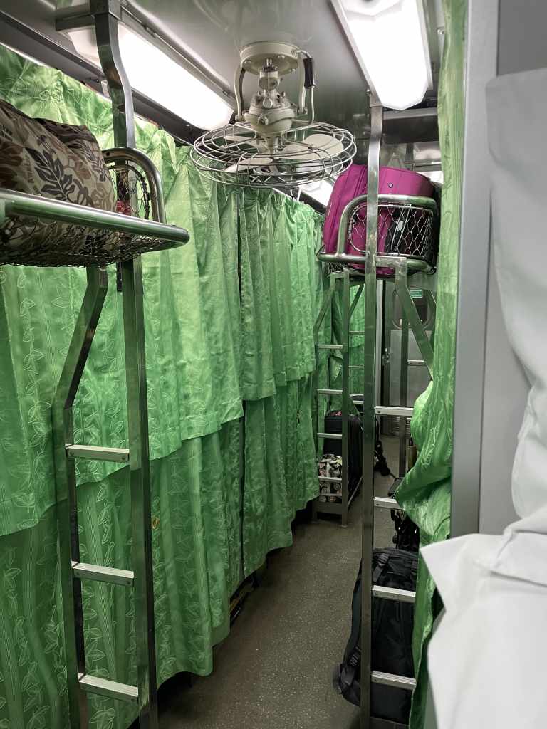 I look out the window while I still can (there is none in the upper bed) and enjoy the diverse view. We’re riding through the suburbs now and there are street food stalls, and dogs running around pretty town houses. Far away, I see the illuminated roof of the Golden Mount and the famous Rama VIII bridge. At different stations, ladies selling snack board the train. And then, at 7.30pm sharp, the train staff begin to make the beds. Once all the upper berths are folded down and secured. The passengers hurry up the metal ladder, and the occupant of the lower bed climbs into their own bed. Everyone immediately closes the lime green curtain, and only occasionally do I hear a phone chime. I‘m still nowhere close to tired and after getting comfortable in my bed, switch on my laptop. It‘s an old one and the battery won‘t last long, but at least I get to watch a couple Netflix episodes I downloaded before.