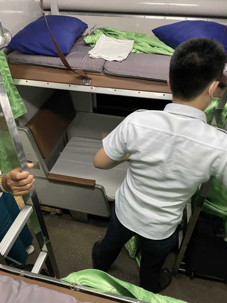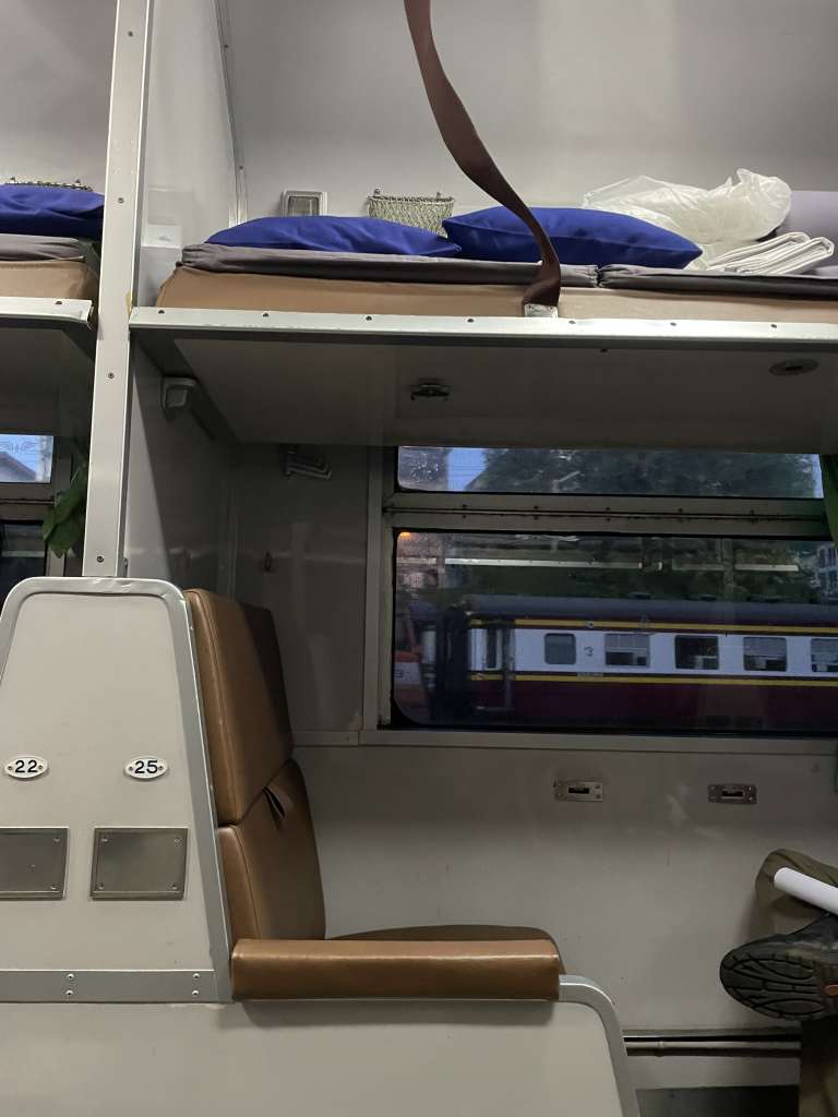 As the sun sets over Bangkok, we’re rolling out of Hua Lamphong, and I‘m munching on my first snacks when we stop in the capital’s second station: Bang Sue. Until now, I was the only person in my row. But now, 2 women and 1 man sit down. They exchange a few words and one of the women points to me and then to the upper bunk. They don‘t try to interact with me, and I don‘t either. The man finally sits down in the seat across from me, leans against the wall, closes his eyes, and dozes off. I am guessing he hoped to already have a bed made? But I‘ll never know. A few rows further, there are 2 cute old ladies with white hair sharing a seat. They chat with everyone. Even the western girl who‘s looking for power outlets and does not speak any Thai whatsoever.