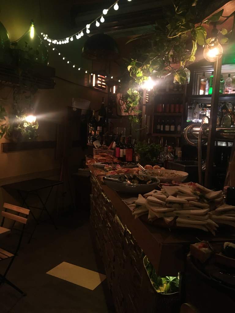 The countless small alcoves make for amazing picture spots, a place to take a break from the exhausting walk in the heat or stop for a snack. Whenever we cross other tourists walking uphill, we can‘t help but pity them and congratulate ourselves on the decision to “splurge” on the cheap bus ride. Once we‘re finally back in town, it‘s already aperitivo-time again. So we find a cute restaurant we liked the day before and order the first of many Mojitos. Every two drinks or so, we start to feel bad about taking advantage of the free food. So we change locations and do the same thing over again. Our favorite bar is a few side-streets away from the main boulevard leading from Fontana dell Nettuno to the towers. It‘s situated in a beautiful old town building and houses countless plants in all colors and sizes. The veranda is covered in cute mismatching wooden furniture and the string lights add the final touch. Their drinks are strong, and what‘s best: there is a whole BUFFET of aperitivo snacks. Once you order a drink, you are free to take whichever dishes you crave: Bruschetta, Ciabatta with ham and cheese, Macaroni salad, Olives, and more.
