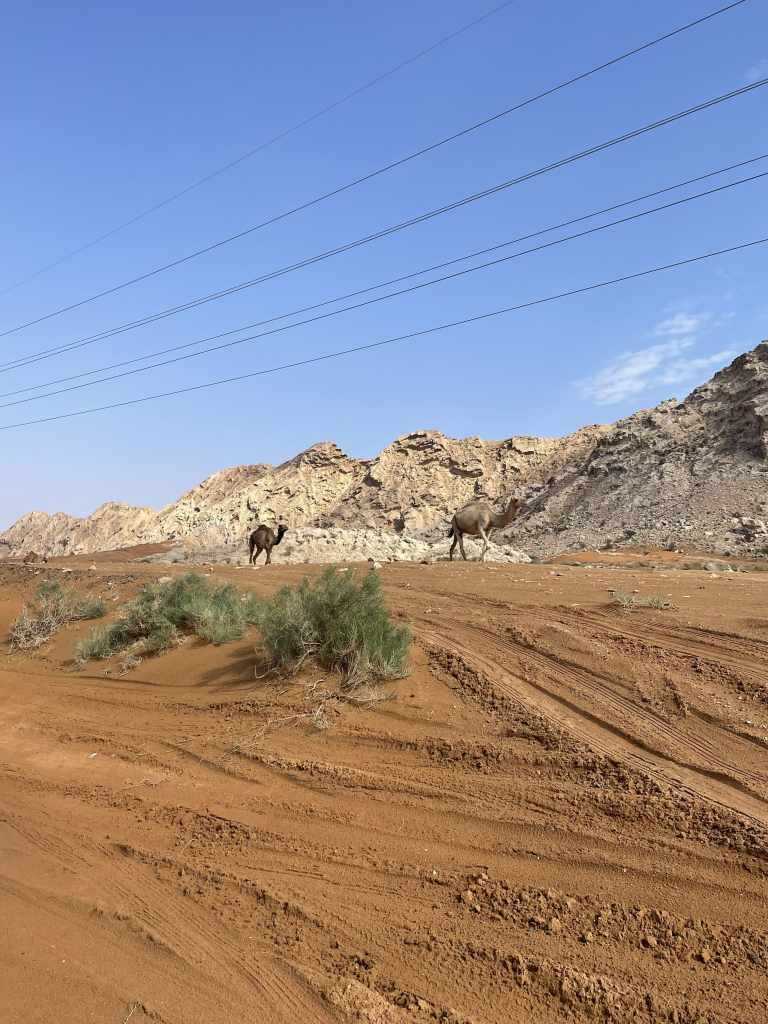 So I continue my drive and head down E55 past more rock formations and bedouin camps. At the next intersection, I turn right onto S153 to see if I can get a view of the backside of the formations. The road bends slightly and snuggles along the dunes that hug the beige rocks. I stop on the side of the road, switch off the engine and with my phone in hand get out of the car. I walk up the soft sandy dunes and, amazed by the colourful cliff, can’t stop to take pictures. Suddenly, I notice something moving in the distance. I look over to the small path running parallel to the main street and see a bunch of grazing camels. One of them lifts its head and when it notices me starts to walk in my direction. The other camels begin to move too, but at a slow pace. I keep an eye out, but not too worried, continue to take pictures. Then the group of animals suddenly picks up speed. I glimpse at their front legs in the hope to see them bound together. Their not. Next, I check the distance to my car and decide to run.