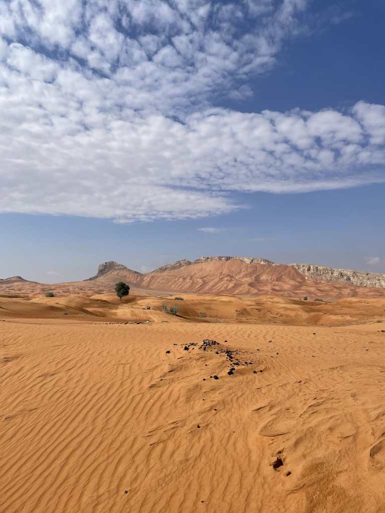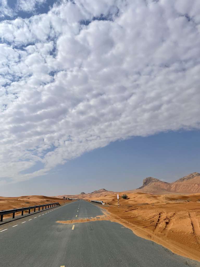 I play with the thought of following a car driving off the highway and onto the small road, which in several places is completely covered in sand. But, remembering a previous episode when we got stuck in the dunes with the exact same car, I stay on the main road and follow the signs to Mleiha. I drive down the small village roads, stopping here and there to capture the magnificent views of Fossil Rock. Once I complete the circle around Sha’byat Al Khattmah, I follow a dirt road to Mleiha Archaeological Centre. And when I say dirt road, I mean exactly that. I try to avoid puddles of mud and potholes as much as I can, but there are still a few occasions when I hear screeching sounds from underneath the car. In the car park of the archaeological centre, I finally decide not to enter the site, because I’m just not down for any of the country’s propaganda that day. I simply want to look at pretty landscapes to clear my head.
