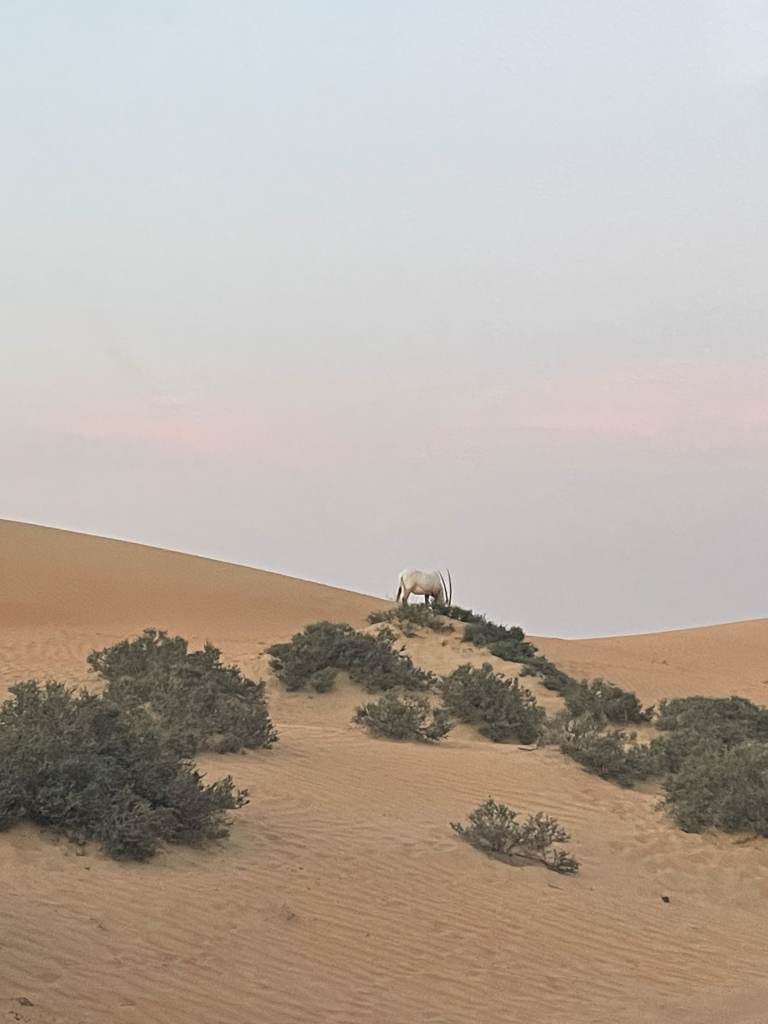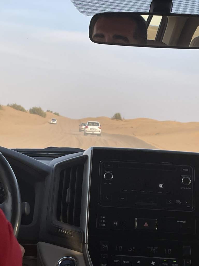 Just when I hastily close the door behind me, the leader of the camel pack reaches the white Nissan Sunny. Pushing his nose up against the passenger seat window, he examines the inside of the small vehicle. I lock the car, wondering how the animal could harm it. Then the camel slowly moves on to check out the front window. This somehow seems to satisfy the desert inhabitant’s curiosity. As he climbs back up the small dune to meet up with the rest of the group, I start the engine and drive off. A few hundred meters further, I see an old Bedouin man crossing the street. The camels must belong to him. Chuckling, I continue my drive and explore the area around Lahbab. There are a couple of small oasis-like palm tree farms and electrical masts lining the desert roads. And when the sun starts to set, I see more and more Emirati families gathering around pick-up trucks on the side of the road for a nightly barbecue. They make it look so effortlessly easy, I immediately want to recreate this experience with my roommates.