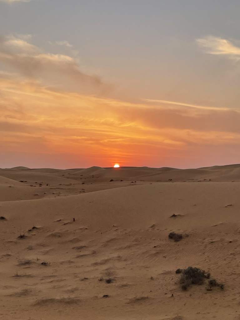 Around 15 minutes later, we arrive at the first photo spot, where our guide shows us some of the local wildlife tracks. We then head on to another place to see the sunset. Once the red ball disappears behind the sand, we are taken to the Bedouin camp, where more activities like sand boarding and camel riding wait for us. But what I personally am looking forward to most, is the Arab dinner buffet. With a choice of Mutabbal, Hummus, Falafel, Chicken Biryani, Couscous, fresh flatbread and more, it’s obvious that I am going back for another round. While we’re enjoying our meal, there is a traditional Arab dance and fire performance happening in the middle of the camp. All in all a very interesting cultural experience, which you don’t usually find a lot of in Dubai.