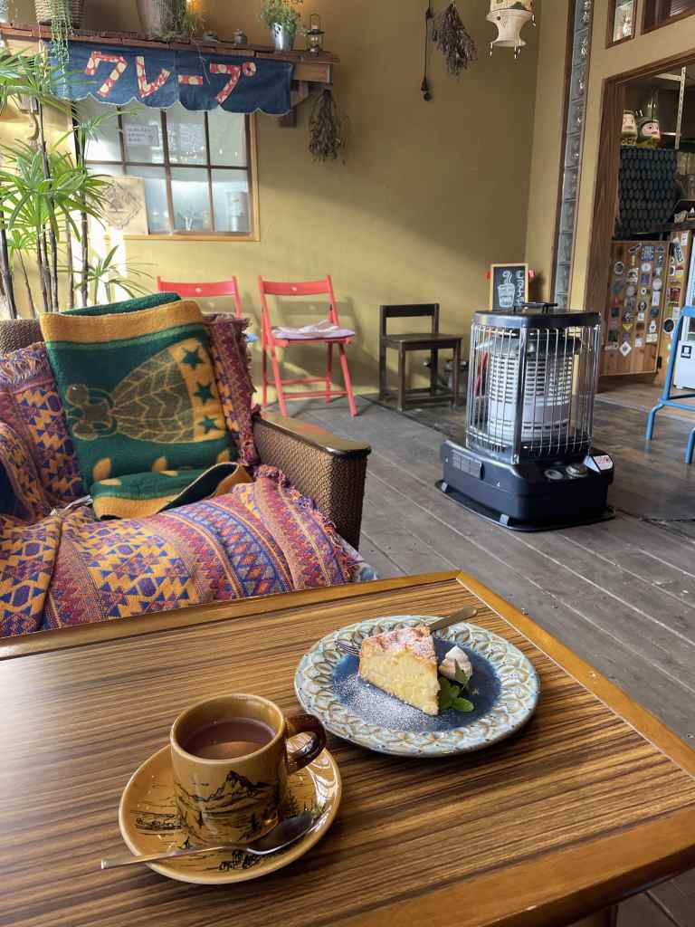 On the way back to the center, the image of a delicious-looking waffle cone with cream and strawberries draws me into one of my favourite cafés in Kusatsu: Watowa. I come back here on multiple occasions to enjoy a cup of Belgian hot chocolate and their Apple cake. The second café I frequent is the Art Café at Sainokawara park. Apart from good coffee, they also have pretty postcards! For a cheap takeaway cup of a hot beverage, I head to Quatre Frère a the bottom of the Yubatake. Speaking of takeaway: of course I couldn’t forget the small street food stalls, serving Yakitori and Mochi and such, that are distributed all over town. One that stands out is the small shop selling traditional Manju as Omiyage (Japanese souvenirs). As I was luckily able to cook at the guesthouse, I only went out for lunch a few times. Those days I treated myself to delicious Zaru Soba with Tempura at Hakukoutei and Yasuragitei.