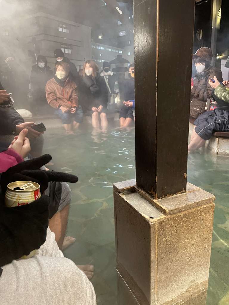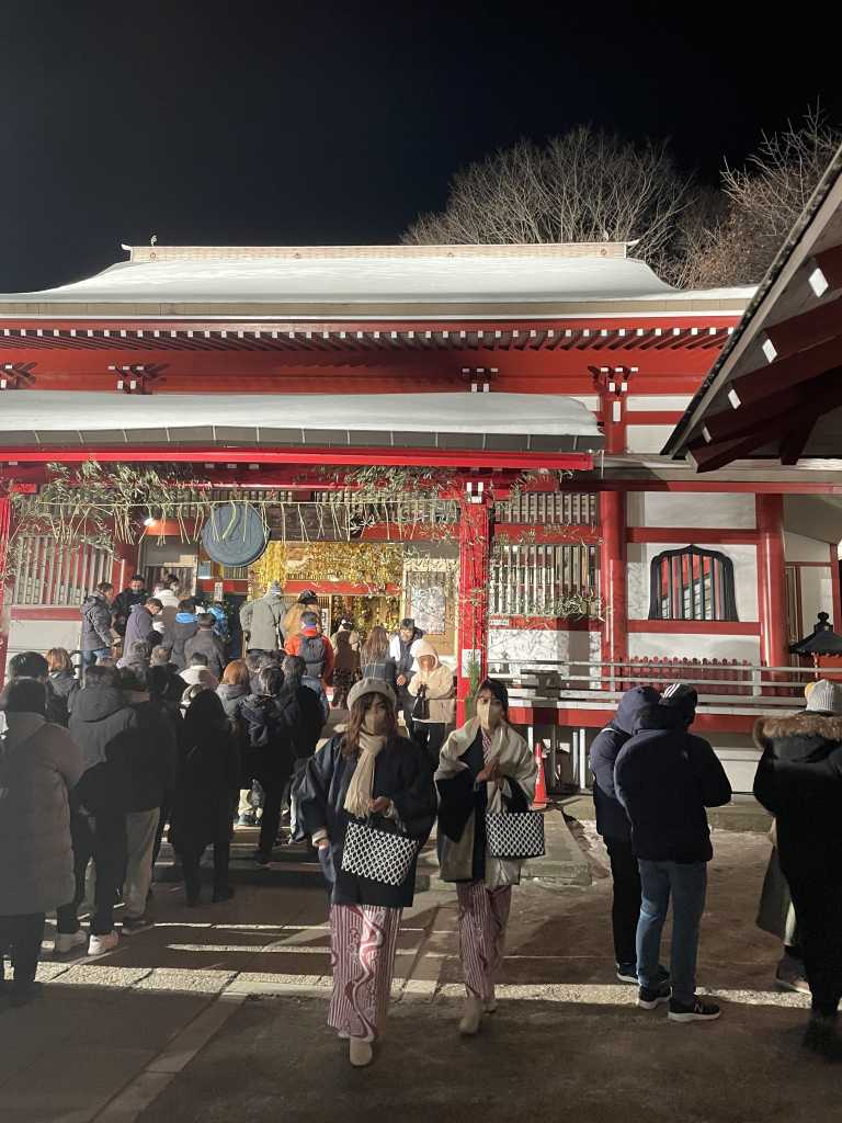 It‘s a big field, where the piping hot water from the natural springs at the foot of the local volcano is collected and cooled down by the cold winter air. From the waterfall at the bottom of the small slope, the now only 60° C warm water is distributed to the various public bathhouses. Located just next to the Yubatake is a 7-11, which is the go-to destination to satisfy any late-night cravings. Adelina, the girl whom I share a room and housekeeping duties with, and I head there on more than one occasion. Several times we find ourselves sitting at one of the free foot baths with a delicious snack in our hands and our feet soaking in hot water. Most nights, a group of young guys come up to us at some point, trying to practice their English or inviting us to drinks and onsen. On New Year’s Eve I also end up at the foot baths with 2 guests. After our feet have been recorded for national TV, we head up to the local Shrine for Hatsumode to follow the Japanese custom of the first prayer of the year.