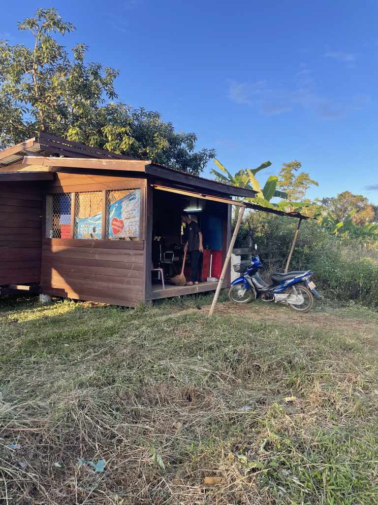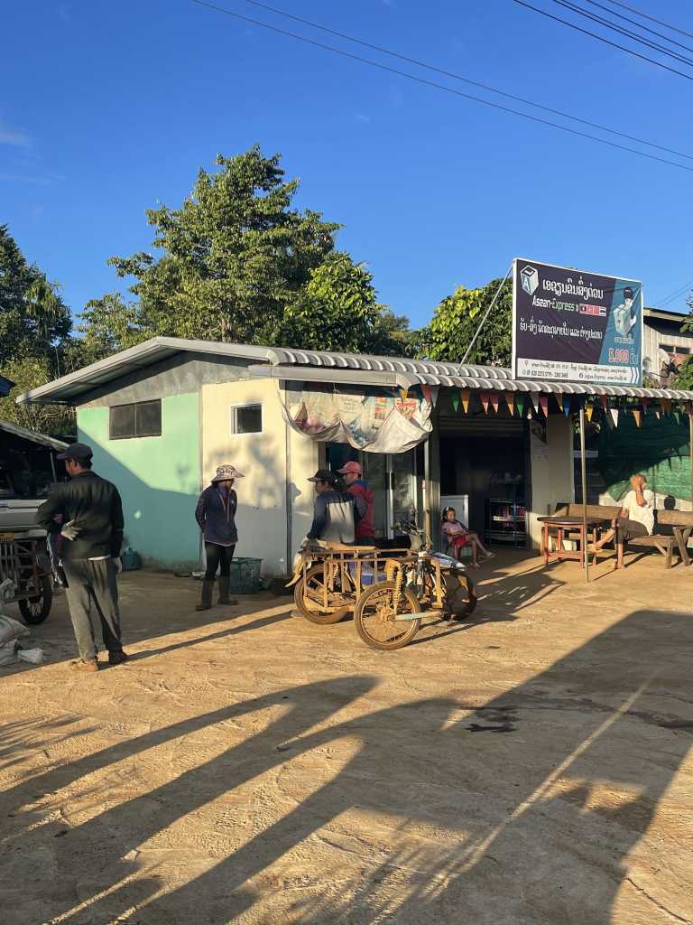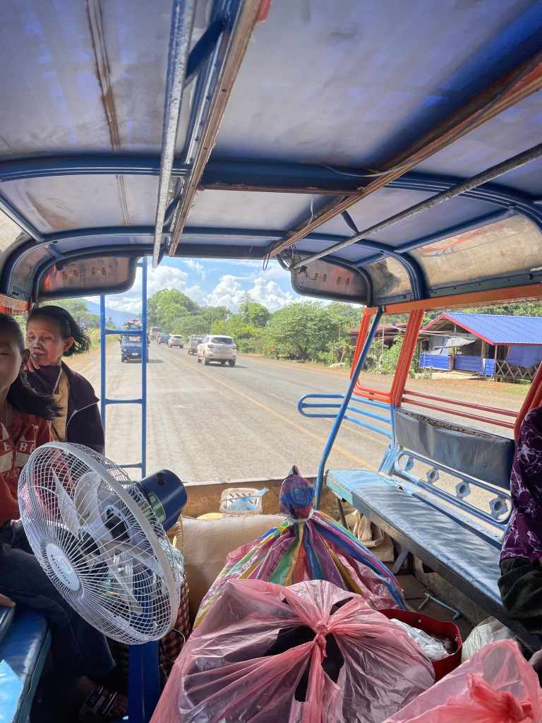 I am lucky to check out right as an old Lao man pulls up with his sidecar motorbike to drop off new arrivals. I negotiate a reasonable fare to go to the local market and he swiftly straps my backpack onto the wooden footrest. During the ride we chat in French and when we arrive at Dao Heuang Market, he promptly asks around for the driver of my Songthaew and makes sure I get a good rate. I jump on the back of the yellow bus and sit down on the bench next to a young lady holding a baby. We leave after around 15 minutes and an uneventful 30-minute ride later, my Google Maps shows that we’re soon passing my destination. So I give the back window of the driver’s cabin a few good hits to request a stop. I pay the negotiated fare and carry my backpack to the side of the road.