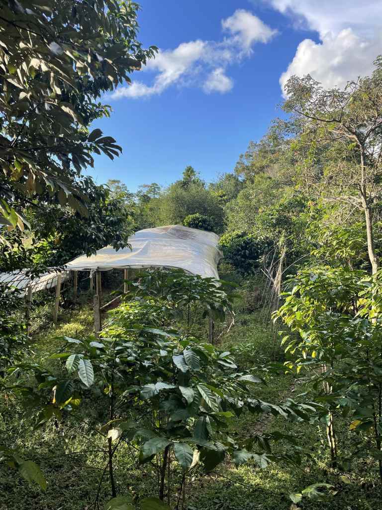 I watch the black fumes of the yellow truck slowly disappear behind the next bend and try to get one of the employees at ETU Green Garden’s attention. Finally, I am let into the property and shown to my private hut for the nights to come. Soumaly, the lady who owns the guest house has told me that she will only return later that evening. So I explore the gardens on my own and am delighted to find a tree house with a hammock strung up on its porch from where one enjoys a magnificent view of the plateau. As the weather forecast is announcing rain in the evening, I decide to make the most of the sunny afternoon hours and head to a coffee research centre I located on Google Maps. The way leads me down a small dirt path, across someone’s farm and finally up a small hill. The entrance to the property looks quite official, but the gate is wide open, so I walk in.