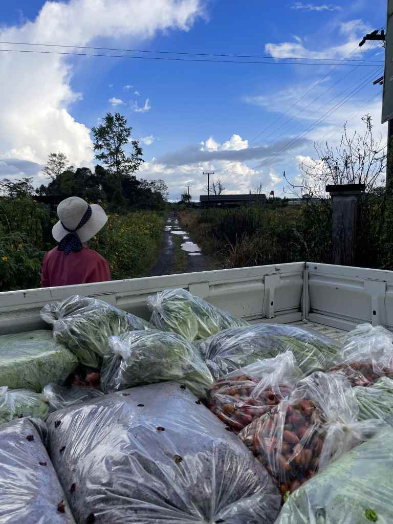 So I soon return to the top and order lunch at the restaurant which Soumaly told me about. The Lao owner enjoys talking to me in French and warns me, that it will be raining soon. And 10 minutes later, the downpour begins. Unbothered, I pull out my book and prepare to read until the rain stops. Suddenly, I hear a man shrieking in the entrance area. He slipped and fell because his flip-flops were not exactly made for this condition. Just at this moment, my phone rings and Soumaly invites me to visit her partner farms in the area. As she is not allowed to enter the waterfall park without paying the entry fee, I run through the rain to her white Suzuki pick-up parked outside. We drive to Paksong and visit various farms to collect organically grown vegetables, which she will present at an upcoming agricultural expo. Walking through the greenhouses reminds of my summer jobs at my town’s nursery when I was a teenager. Except that they didn’t have chickens running around the patches.