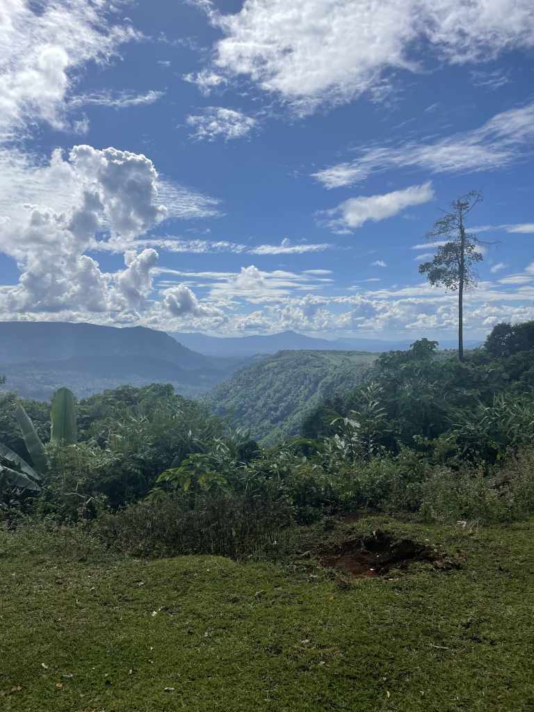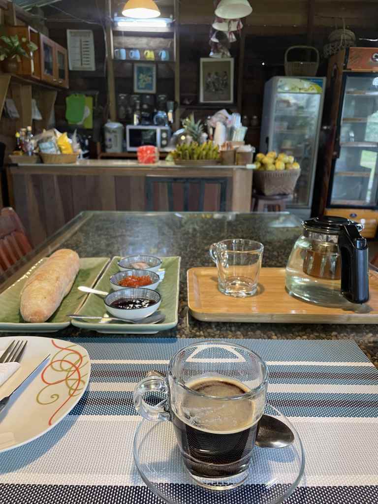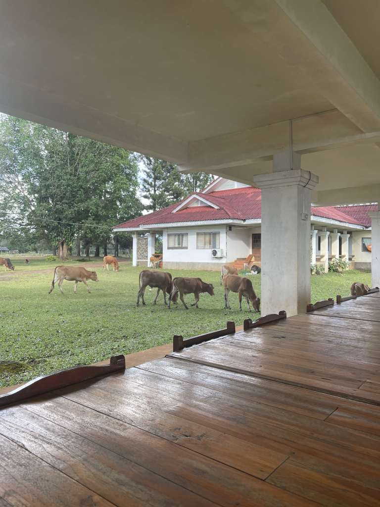 There are cows grazing freely, and a rental car is parked underneath one of the stilt houses. I walk towards the rental car and soon spot the sign saying “I love Lao coffee”, where a Thai couple is taking pictures. The view of the lush green valley below is simply stunning, so I also take a few commemorative photos and sit down at one of the long wooden tables. Just when I’m about to leave, an Eastern Asian man comes down the stairs and asks where I’m from. He’s a Korean researcher stationed at the agricultural center for 3 months. We end up chatting about our travel experiences and sustainable farming practices for 2 hours before the rain clouds appear. I barely make it back to the gardens before the downpour begins. That night Soumaly’s daughter prepares an amazing dinner for me and I soundly fall asleep to the sound of the raindrops falling on the roof of my wooden hut.
