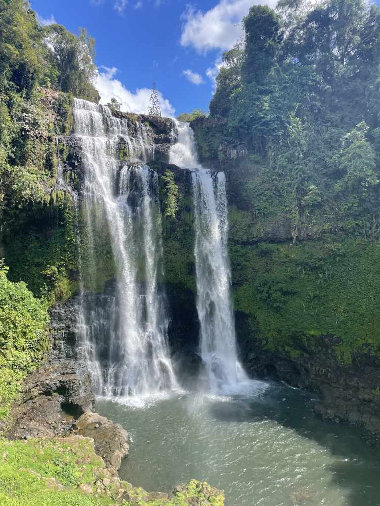 The next day, after a hearty breakfast, I decide to walk the 6.5 kilometers along the Pakse loop to Tad Gneuang waterfall. Fortunately, the climate on the plateau is pleasantly mild and I am not sweating for the first time during my stay in Laos. On the way, I enjoy the glimpses I get into the small roadside shops, car repair places, and wooden houses. I pass free-running chickens and men burning rubbish in their courtyard. Whenever I exchange a glance with someone, I politely greet them with “Sabaidee” which they usually respond to with a big smile. Shortly before I reach the intersection to the waterfall, a tourist on a scooter offers me a ride. We bounce down the dirt track and pay the entrance fee. As both of us want to take some time to read, we part ways after passing the main bridge. I explore the top of the waterfall before climbing down the steep stairs to the pool on the bottom. I was planning to swim here, but the wind and the gushes of water are too strong.