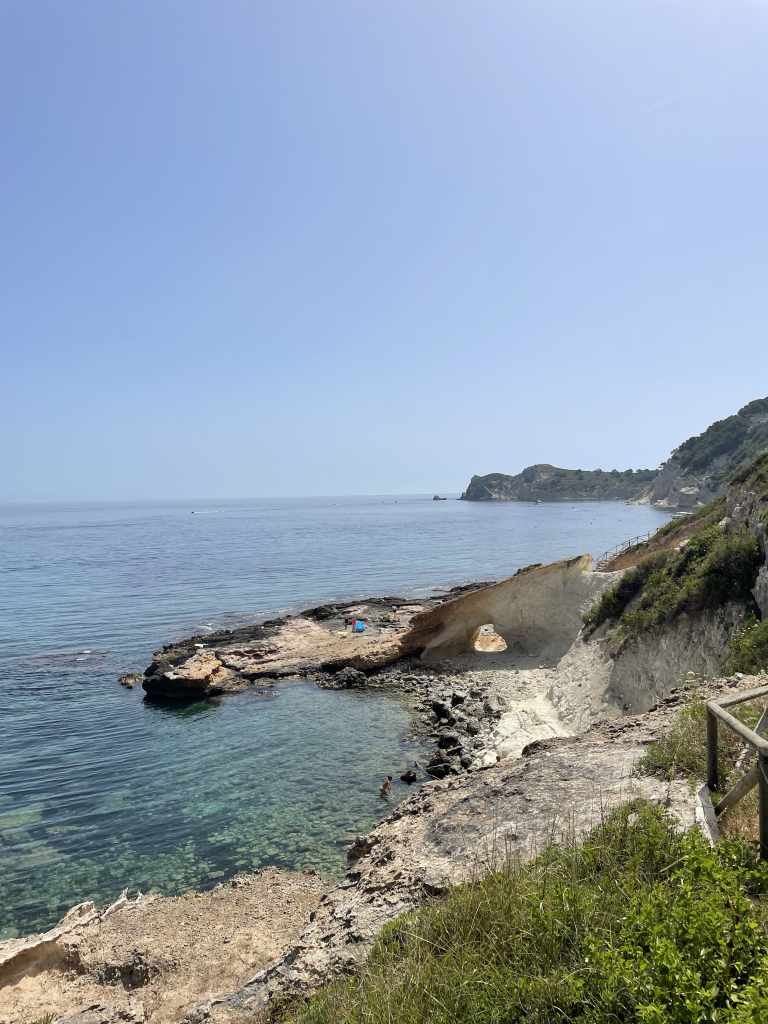 The first Cala I explore is the easily accessible Cala Blanca in Jávea. However, I find it to be a bit too exposed and crowded. So I continue to walk through the picturesque stone arch and along the water until I reach La Caleta de dins. It’s a wide bay with plenty of suitable big rocks to spend a lazy afternoon on. There are groups of locals who came from Valencia for a day trip, a French family on holiday with their kids, a Spanish couple from the north, and a few older people soaking up the sun. I find a large rock, which is situated on a natural pier separating the calm waters of the bay from the waves of the Mediterranean Sea. I place my towels on it and begin to unwrap the sandwich I brought for lunch.