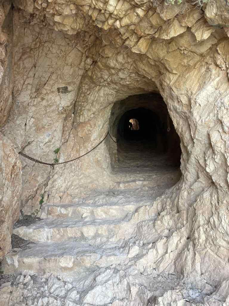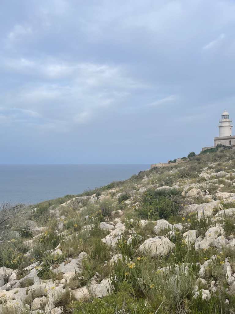 But fortunately, after a quick break to enjoy the view of the two bays with crystal clear water far below me, I decide to continue the adventure. While the short tunnel provides much-needed shade, its lack of illumination and the incline combined with slippery stone makes it a challenge to reach the ocean side of the Penyal. But eventually, I make it back out into the light and am greeted with the most incredible view. A small, sandy trail meanders along the cliffs, which are dotted with rocks and small needle trees. Birds circle above me as I hike on the unpaved path to the very edge of the peninsula.