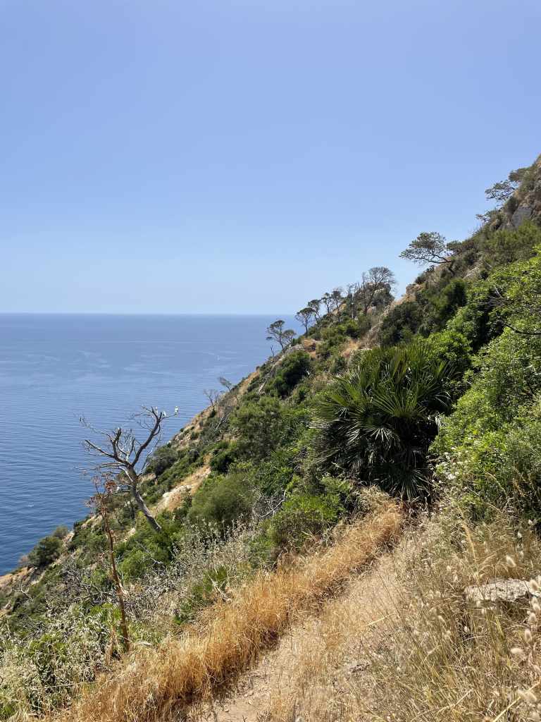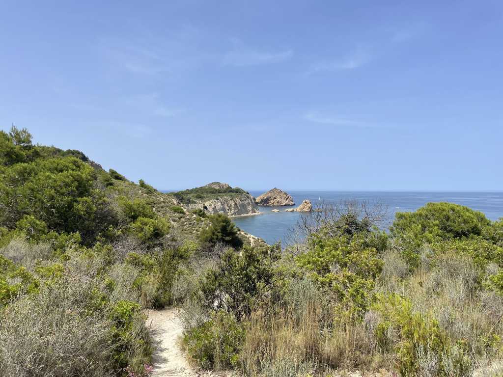 A few days later, I’m back on the first bus to Cala Blanca. But this time I don’t stop here. I continue to walk up the tree-lined street, taking me to one marvelous viewpoint of the cobalt sea after another. About 45 sweaty minutes later, I arrive at Creu del Portitxol which overlooks Cap de Sant Martí. From here it‘s a downhill stroll through the national park to the Cala del Portitxol. It‘s hard to choose a trail because all of them potentially lead to amazing views of the different bays. I end up walking all the way to the Mirador del Portitxol and from there descend on a steep trail leading down to the rocky beach.