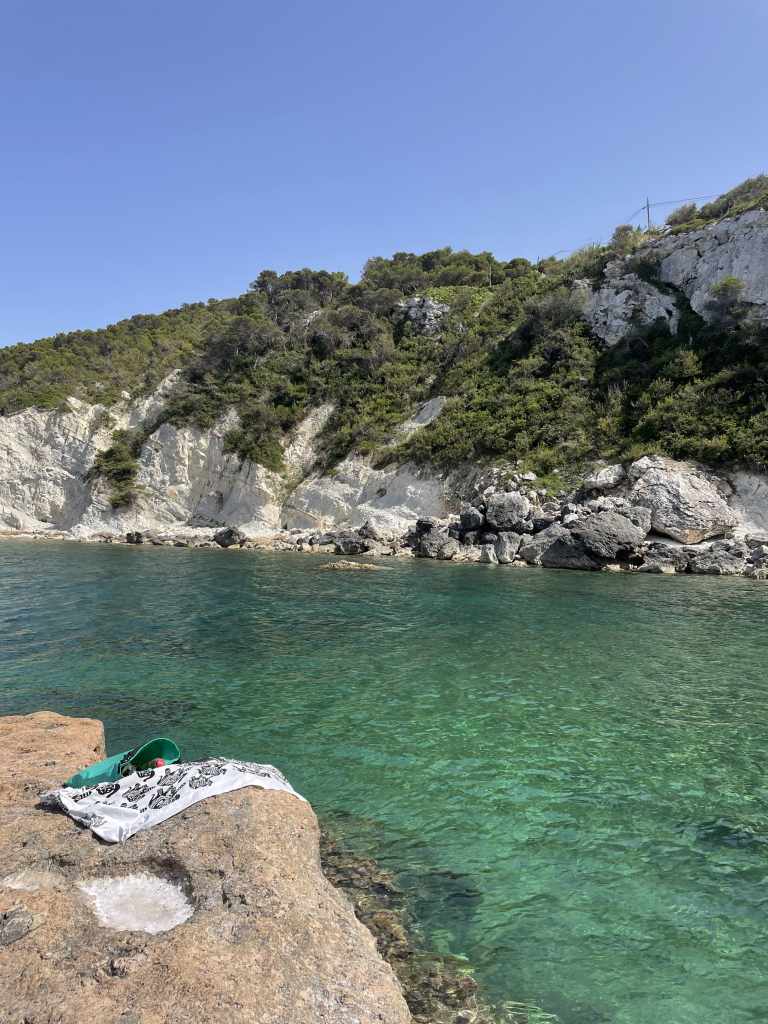 As it’s just past midday by now, there are already a number of people spread out on their striped bath towels. The locals are easily distinguishable from the tourist due to their professional set up including low beach chairs, umbrellas, coolers for drinks and lunch, water shoes and snorkeling gear. They effortlessly enter the water when it‘s time for a break from the sun. Tourists like myself stagger barefoot across the hot pebbles only to then trip on slippery rocks and inelegantly fall into the low tide. As it‘s still a refreshing change from the burning sun, I repeat this process several times.