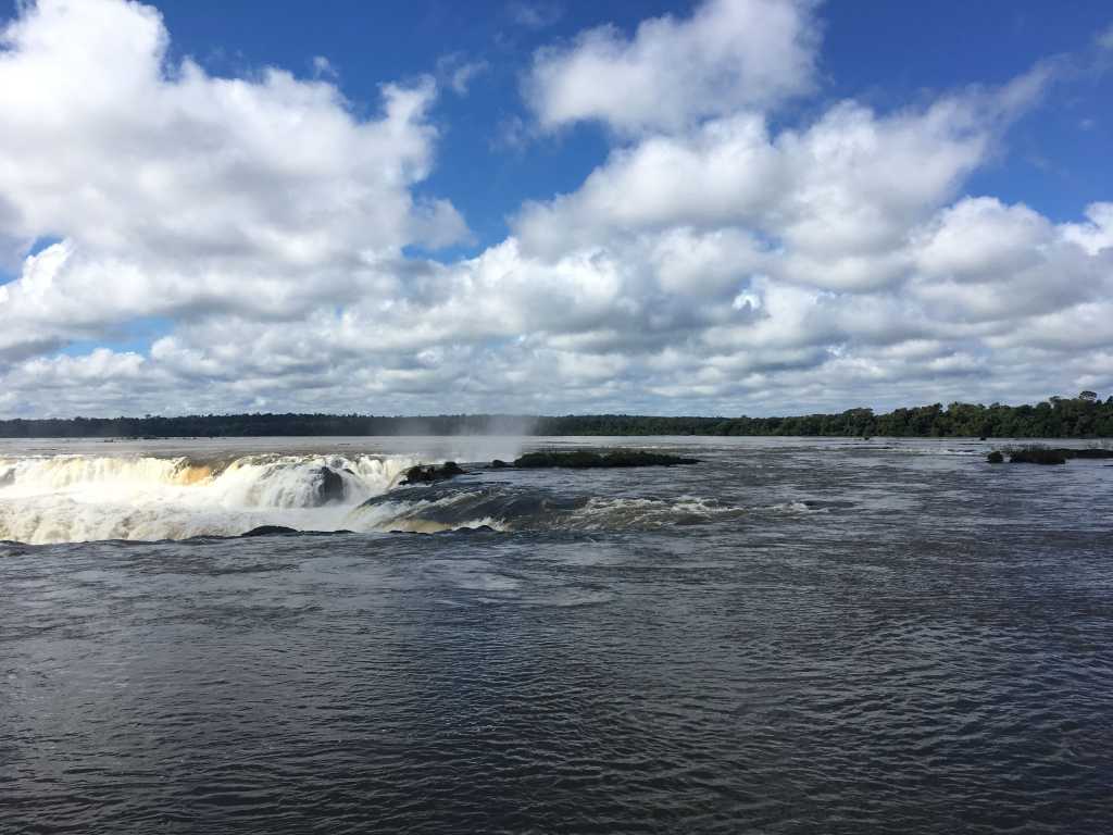 I stay there for a while and then follow the trails leading to Estación Las Tres Marías. From here, I take the electric train to the entrance of the trail leading to the Devil’s Throat viewpoint. It can take around 60 tourists at a time and is free of charge, is a highly frequented spot at the Argentinian park. The slow ride through the jungle takes a few minutes. After getting off the small train, I try to get away from the crowd as quickly as possible. I‘ve seen a bunch of possible slow-walkers and even the thought of being stuck behind them for the whole stroll over the narrow, 1 km-long bridge is horrible. So I basically run towards the stilt walkway and am the first to arrive at the platform hanging above the roaring waterfall which is shaped like a U. I take advantage of being alone and snap some pictures. I take a quick break, sitting down on one of the few benches scattered at the viewpoint. Then, I stroll back across the low bridge. This time I take my time to marvel at the way the quiet waters transform into racing currents and finally soar down the falls within less than a mile.
