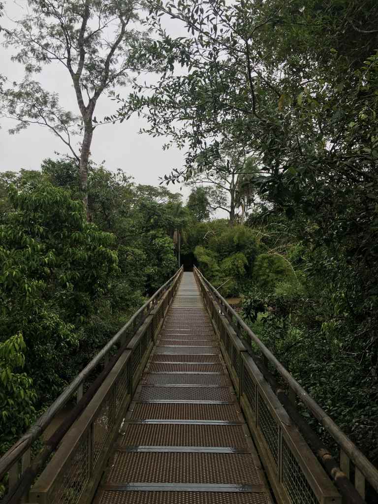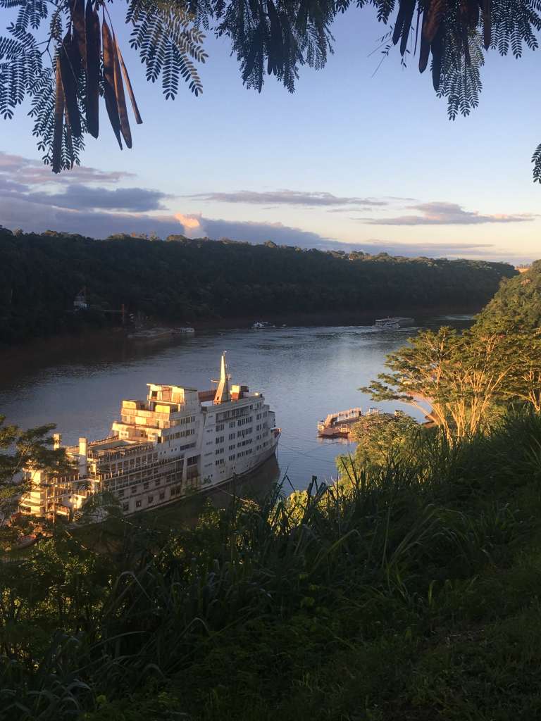 Having sorted out all the administrative to-dos, I have the late afternoon to myself. I pick up the book I’m currently reading at the hostel and then go for a walk along the Iguazú River. This is the river separating Argentina and Brazil, which eventually takes a deep plunge at the Iguazú Falls a couple kilometers downstream. However, the original source of the water is Río Paraná, which separates Argentina and Brazil from Paraguay. As Puerto Iguazú is conveniently located in the corner where the three countries meet, I make the statue marking this location the destination for my sunset stroll. Once the red ball disappears behind the horizon, I return to my hostel, have dinner at the in-house restaurant, and pack my backpack before going to bed early. Following the hostel owner‘s recommendation, I want to catch the first bus to the national park in order to avoid the big crowds.