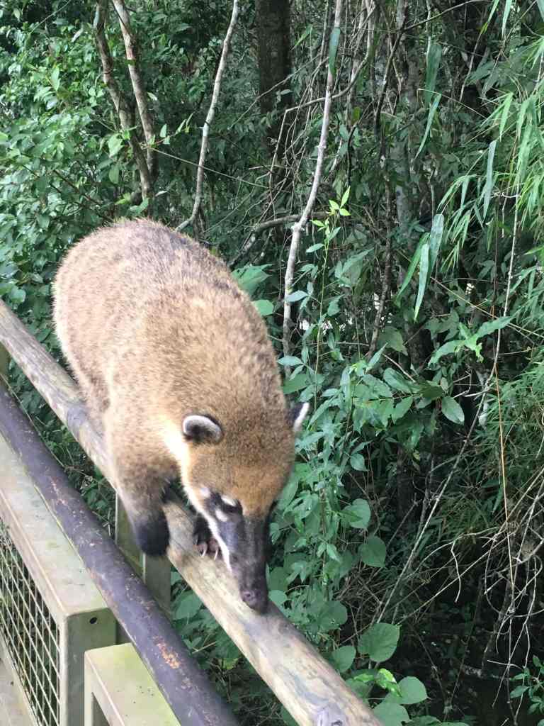 For most of the morning, I have the trails and magnificent views to myself. Sporadically, I sit down in a spot and enjoy the full immersion in nature. I listen to the birds singing, watch butterflies move from flower to flower, and soak up the sun. Sometimes I pass a Coati, one of the cute raccoon-like inhabitants of the park. They can often be seen sitting on the railings keeping tourists out of their natural habitats. They are very used to people and friendly. From time to time the long-nosed creatures come up to me, to see if I have some treats for them. Realizing I don‘t, they quietly head away to check on the next tourists. At one resting area, I see a gang of Coatis taking over a table covered in leftovers from a US family‘s lunch. Some people feed them potato chips or popcorn. Others buy snacks for the animals from the designated vending machines. I enjoy my own lunch sandwich on a secluded bench, far from humans and animals. The sunlight shining onto the number of small waterfalls in my view creates beautiful rainbows.