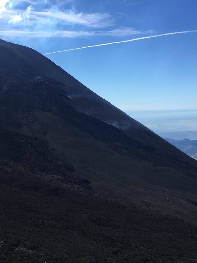 As we gain altitude, the inclination grows and so does the amount of sand covering the trail. Even though my trekking shoes come with a good profile, with every step forward, I slide right back down to where I was before. My friends with the running shoes are obviously struggling even more. When we reach the top of a small hill, the three of us are just happy to be able to take a break. So we don‘t even notice the rising smoke and a small lava flow on the summit next to us. While I did read that there is a good chance of seeing lava here, I thought it‘s more of a marketing thing to sell the tours.