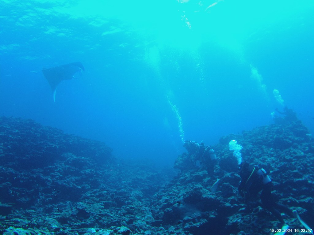 Nevertheless, both of them are happy with snorkeling, while I go on a second dive in the afternoon. The dive shop owner asks me whether I want to give Manta Scramble a try, even though it’s off-season and the chance for sightings rather low. We all agree to give it a try anyway and off we are. The boat ride itself is well worth the money, and once we arrive at the island’s most famous dive spot, we see several other boats with eager divers. Instructor-san and I waste no time getting ready and quickly descend into the open water. At around 10 meters deep, we follow the colourful corals to a small meadow. Suddenly, I see a lot of bubbles from other divers. I look up and find a mighty manta ray circling around a swarm of cleaning fish.